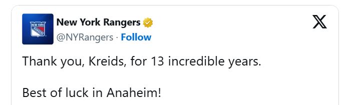 Although Kreider ranked third on the Rangers with 22 goals, his overall struggles were a key factor in the team missing the playoffs for the first time in four years—capping off one of the most disappointing seasons in franchise history. So, while this day felt both inevitable and necessary for Kreider and the Rangers, it still comes as a bit of a shock given his significant place in the franchise’s history.