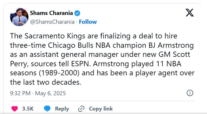 According to ESPN’s Shams Charania, “The Sacramento Kings are finalizing a deal to hire three-time Chicago Bulls NBA champion as an assistant general manager under new GM Scott Perry.”